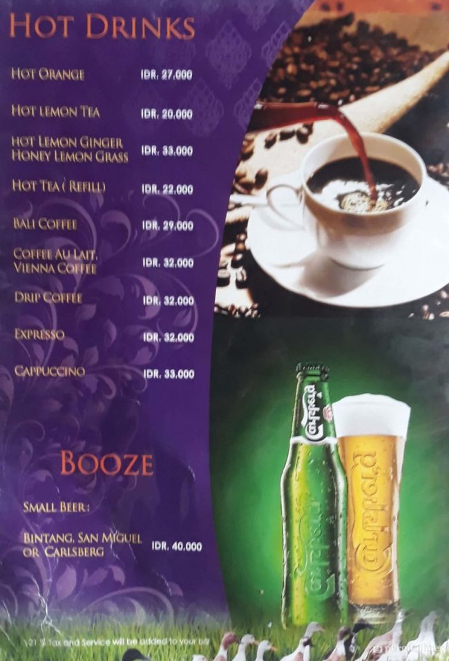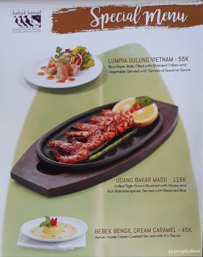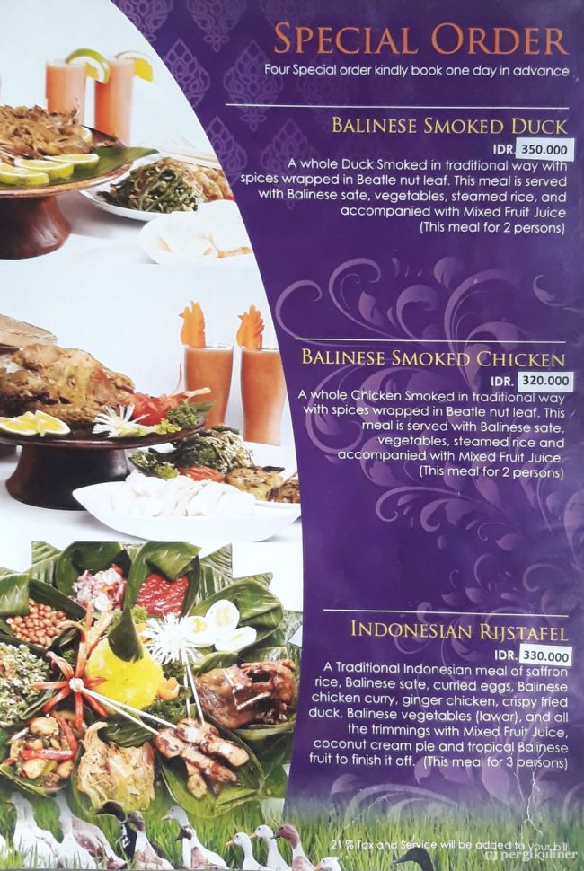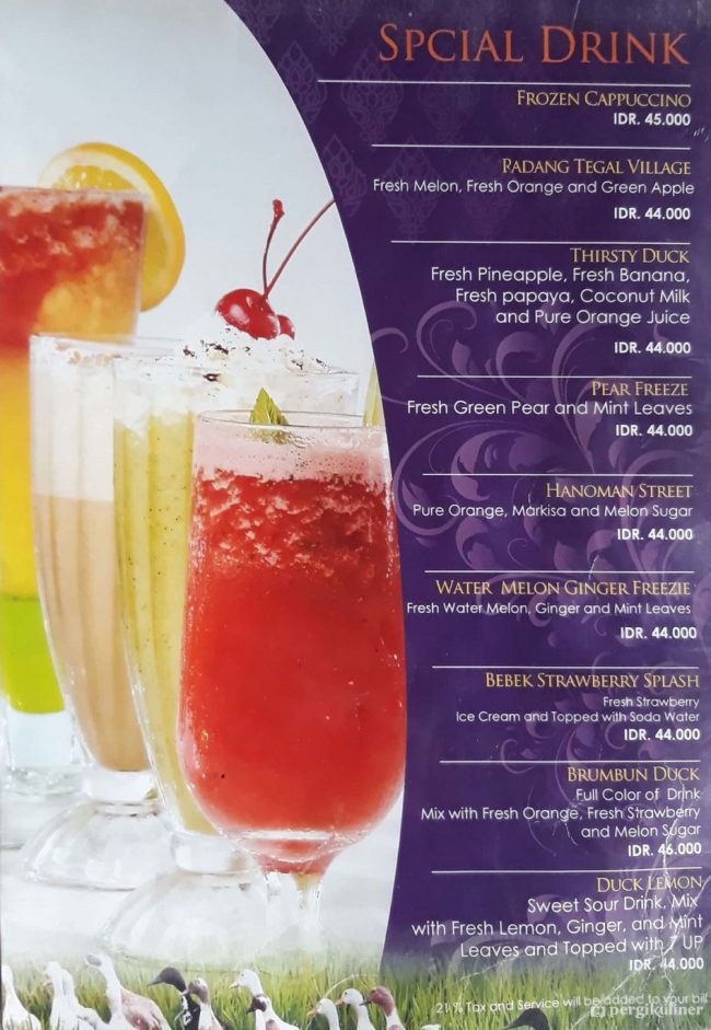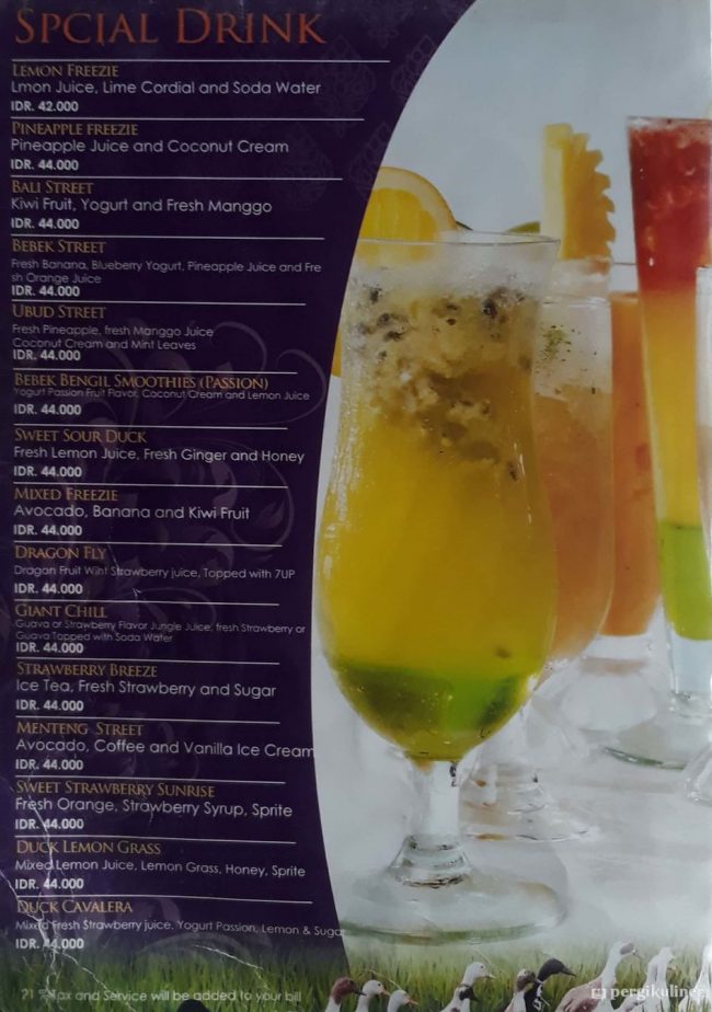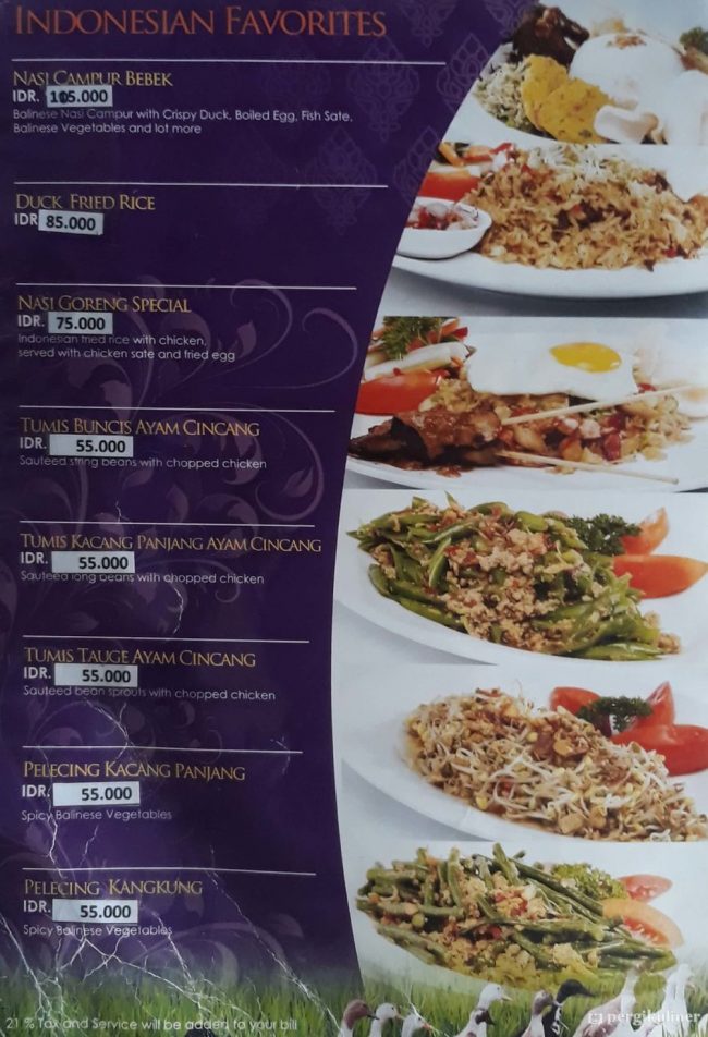 Dari sekian banyak menu yang tersedia ada beberapa menu spesial yang menjadi favorit pelanggan. Menu favorit disini yaitu The Original Crispy Duck, bebek setengah ekor yang digoreng kering dan disajikan dengan nasi dan sayur khas Bali. Ada juga Grilled Duck with Sweet Chili Sauce.